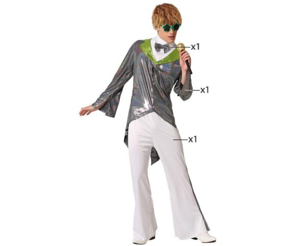 Disfraz de Estrella de Rock Plateado para Hombre, compuesto por chaqueta plateada brillante con detalles verdes, cuello con pajarita y pantalón blanco.