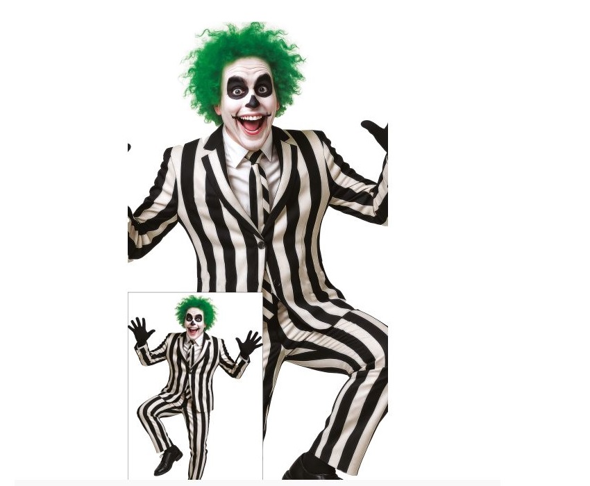 Disfraz de Fantasma a Rayas para Hombre, compuesto por chaqueta, corbata y pantalón. Con este disfraz podrás caracterizarte como Beetlejuice.
