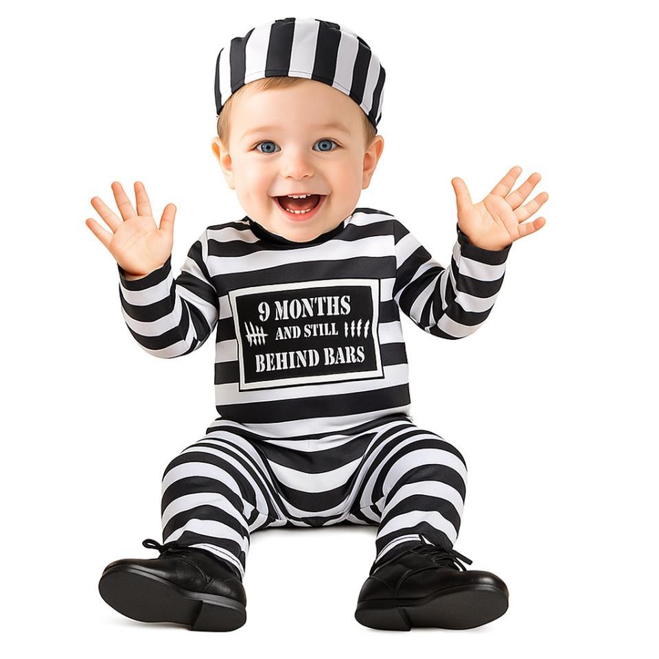 Disfraz de Preso a Rayas para Bebé, compuesto por mono y gorro.